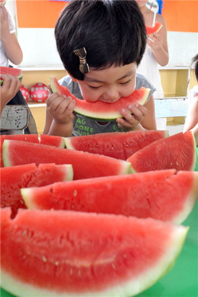 A girl from Shuguang Lantian Kindergarden of Handan city, North China's Hebei province eats a piece of watermelon on August 6, one day before this year's Chinese traditional solar termLiqiu, to wish for a cool autumn. [Hao Qunying/Asianewsphoto]