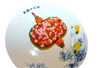 The dish is presented in the shape of a phoenix inside a lantern. The phoenix is shaped of shelled shrimp that retain their shelled tail. The shrimp is pan-fried so that the meat is white and the tail turns red, like the tail of the legendary phoenix. The “l(fā)antern” surrounding the shrimp is made of cucumber slices.