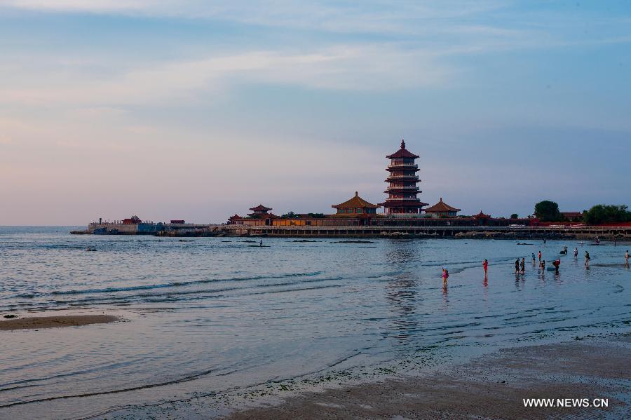 Tourists stroll on a beach in Penglai, a popular tourist destination of east China's Shandong Province, Aug. 8, 2013. (Xinhua/Zhang Cheng) |