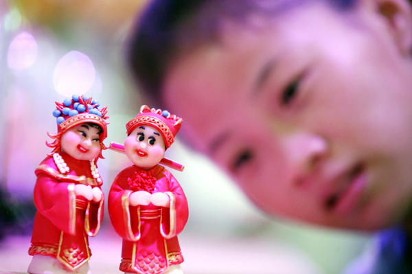 A young boy enjoys looking at Chinese dough figurines at a traditional Chinese wedding at the Nanjing International Expo Center on August 11, 2013. [Photo/Asianewsphoto]