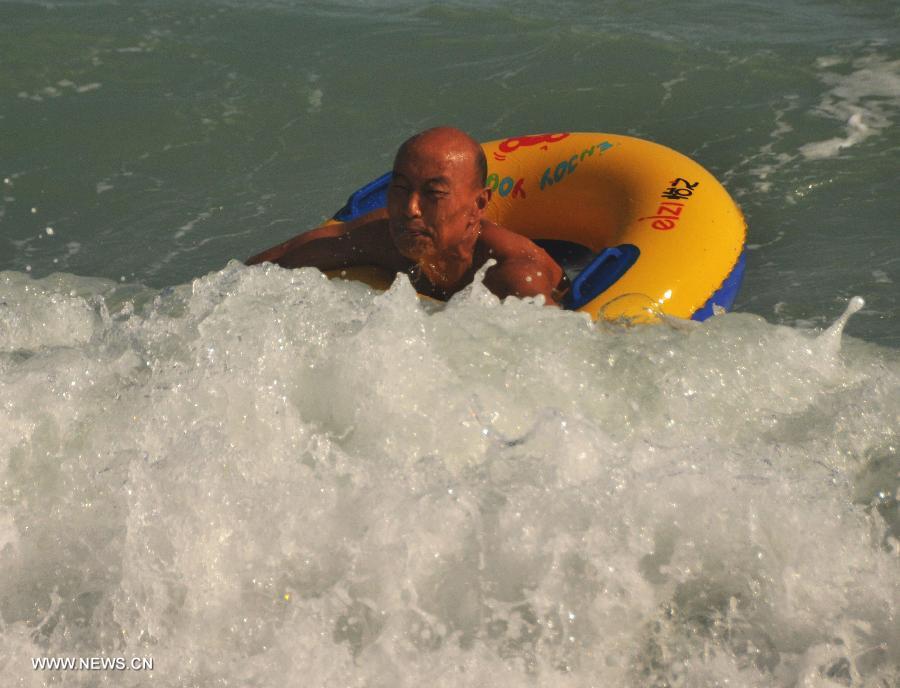A tourist cools off in the sea in Sanya, a coastal resort of south China's Hainan Province, Aug. 9, 2013. Tourists refresh themselves in a tourism city of Sanya, which was ever influenced by two tropical storms recently. (Xinhua/Zhang Yongfeng)