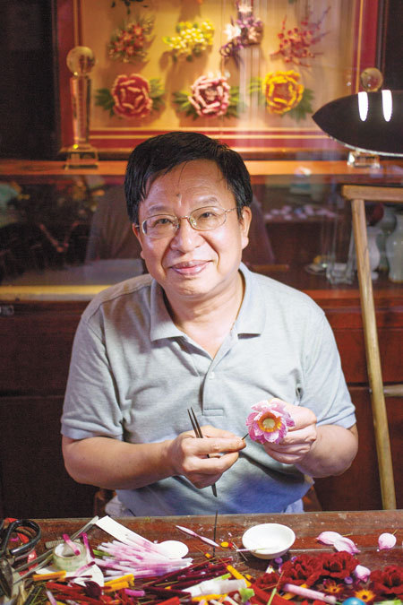 Zhao Shuxian, 59, one of the few velvet flower craftsmen in China, started his apprenticeship in the industry in the 1970s. Gao Erqiang / China Daily