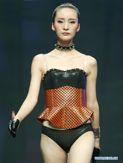 Contestant Tang Yuhan presents underwear outfits during the final of the model competition held in Foshan, south China's Guangdong Province, Aug. 18, 2013. A total of 40 contestants across the country compete for the crown on Sunday. Tang won the championship finally. (Xinhua/Chen Jianli)