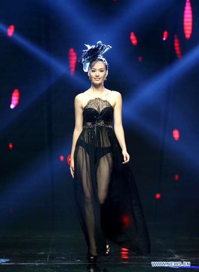 A contestant presents underwear outfits during the final of the model competition held in Foshan, south China's Guangdong Province, Aug. 18, 2013. A total of 40 contestants across the country compete for the crown on Sunday. (Xinhua/Chen Jianli)