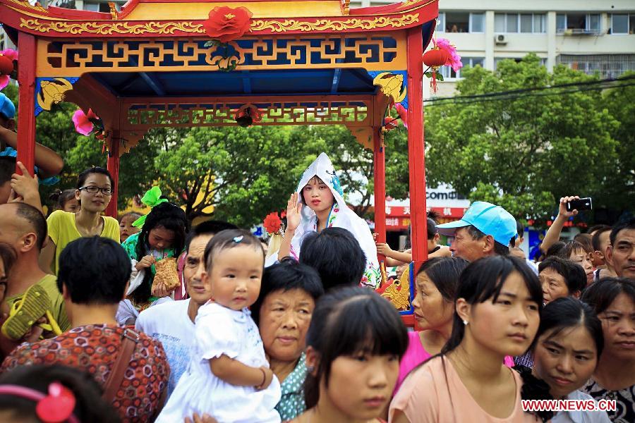 People participate in a celebration for the Hungry Ghost Festival in Xiangshan county of East China's Zhejiang province, Aug 21, 2013. The traditional Hungry Ghost Festival falls on Wednesday this year. [Photo/Xinhua]