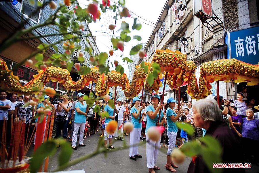 People participate in a celebration for the Hungry Ghost Festival in Xiangshan county of East China's Zhejiang province, Aug 21, 2013. The traditional Hungry Ghost Festival falls on Wednesday this year. [Photo/Xinhua]