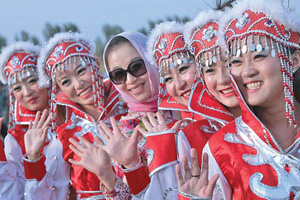 Brides of the Uygur ethnic group take part in a group wedding ceremony in Turpan, Northwest China's Xinjiang Uygur autonomous region, Aug 22, 2013. As a part of the 22nd Turpan grape festival, tourists in the city witnessed the group wedding on Thursday. [Photo/Xinhua] |