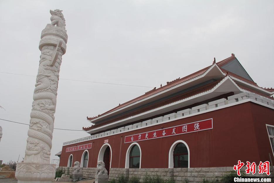 Copycat Tiananmen Square in Liaoning. With a palace-similar roof and two marble pillars, this building in Suizhong, Liaoning can hardly not be relate to the Tiananmen Square in Beijing.[Photo/Chinanews.com]