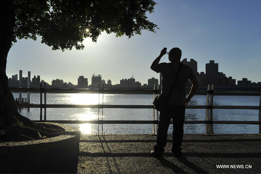 A man takes photo of the sunset by the Dadaocheng wharf in Taipei, Southeast China's Taiwan, August 27, 2013. Dadaocheng was an important trading port in the 19th century, and is now a tourist attraction and shopping area.[Photo/Xinhua]