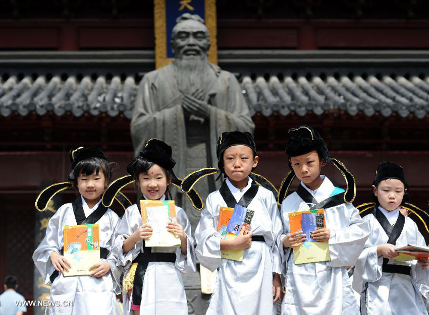 Twin sisiters Wang Yujing, Wang Yujie and twin brothers Ding Yang and Yang Zhi (1st to 4th L) pose for pictures during the first writing ceremony at Fuzimiao, or the Confucius Temple, in Nanjing, capital of east China's Jiangsu province, Sept. 1, 2013. In total 370 first-graders of Fuzimiao elementary school in Nanjing participated in the first writing ceremony Sunday. The ceremony is a traditional education activity for children in China. [Xinhua/Sun Can]
