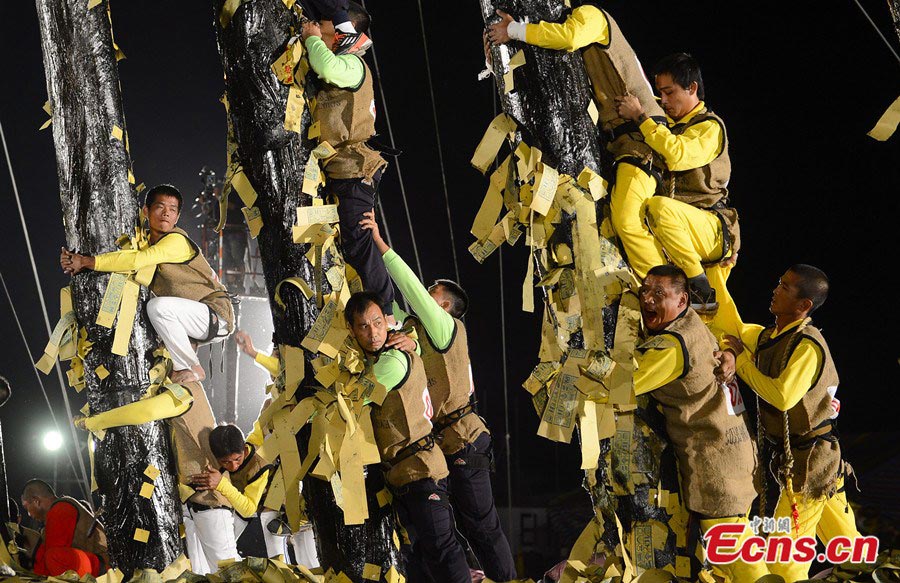 Team members climb the pillars of the "Gu rack" at a Qianggu ceremony in Toucheng of Yilan, Taiwan on September 4, 2013. Each pillar is about 15 storeys high and has a thick layer of oil on it. The traditional ceremony takes place at the end of every ghost month, lunar July. This year a total of 16 teams participate in the competition. (CNS/Liu Zhen) |