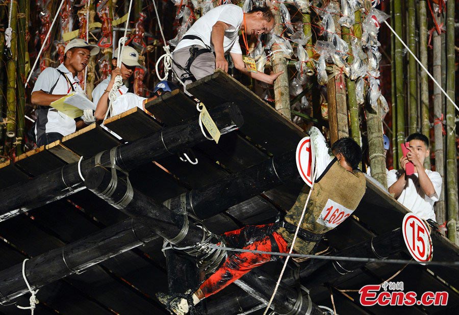 A Qianggu ceremony is held in Toucheng of Yilan, Taiwan on September 4, 2013. The traditional ceremony takes place at the end of every ghost month, lunar July. This year a total of 16 teams participate in the competition. (CNS/Liu Zhen) |