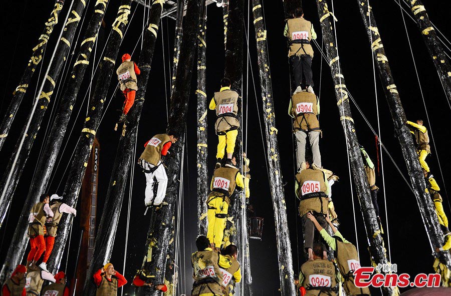Team members climb the pillars of the "Gu rack" at a Qianggu ceremony in Toucheng of Yilan, Taiwan on September 4, 2013. Each pillar is about 15 storeys high and has a thick layer of oil on it. The traditional ceremony takes place at the end of every ghost month, lunar July. This year a total of 16 teams participate in the competition. (CNS/Liu Zhen) |