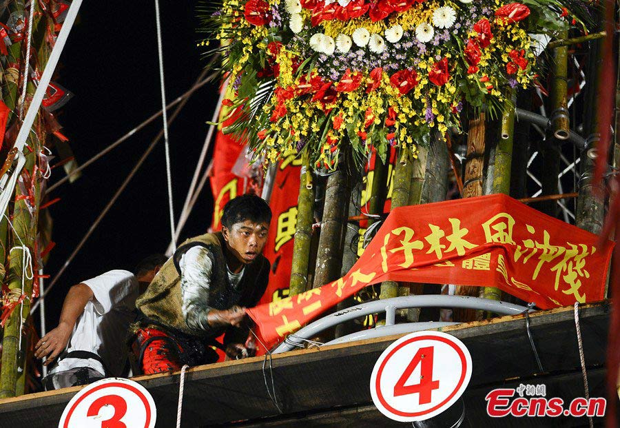 A Qianggu ceremony is held in Toucheng of Yilan, Taiwan on September 4, 2013. The traditional ceremony takes place at the end of every ghost month, lunar July. This year a total of 16 teams participate in the competition. (CNS/Liu Zhen) |