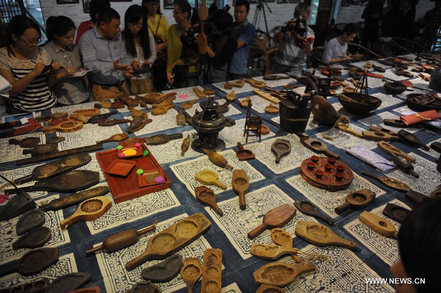 Ancient baking molds of mooncake are seen at a folk culture museum in Hefei, capital of east China's Anhui province, Sept. 5, 2013. Mooncake is a Chinese bakery product traditionally eaten during the Mid-Autumn Festival, which falls on the 15th day of the eighth month of the lunar calendar. [Xinhua]