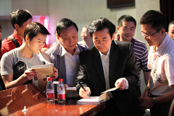 Author Zhang Wei draws a crowd of fans after his public speech about writing and cultural development in Guilin, Guangxi Zhuang autonomous region. Photos Provided to China Daily |
