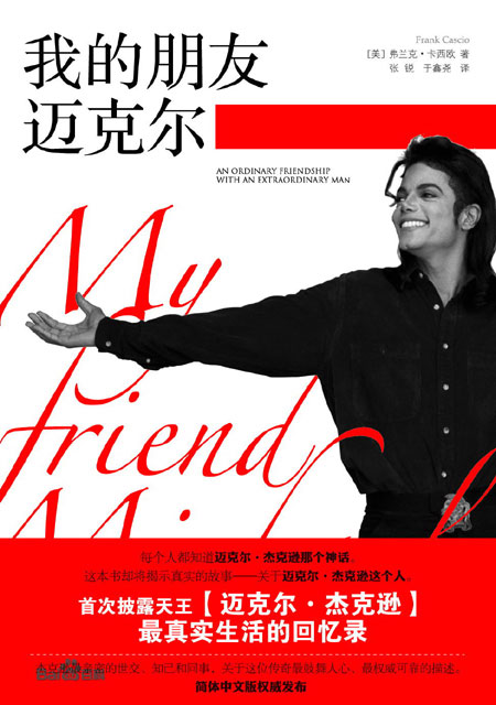 The late King of Pop Michael Jackson was a legend to most, especially to his fans. However, to a small group of people who used to be his working partners and friends, Jackson was first and foremost a human being. To Frank Cascio, Michael Jackson was his second father, his big brother, boss, mentor and teacher, but mostly his friend. Since the age of 5, Cascio had witnessed the icon reach the summit as the world's greatest entertainer, as well as his traumatization following scandals, lies and false accusations. In 2011 - two years after Jackson's tragic death - Cascio published the book My Friend Michael, to reveal "an ordinary friendship with an extraordinary man". Cascio offers a deeply personal and behind-the-scenes look at the Michael Jackson he knew, with never-before-told stories and 32 pages of never-before-exposed private photos. The book has been translated into Chinese before the 4th anniversary of the icon's death and his 54th birthday. Published by Lijiang Publishing House, the book is translated by Zhang Rui and Yu Xinyao, two of Jackson's hard-core fans as well as key leaders of the singer's Chinese official website.