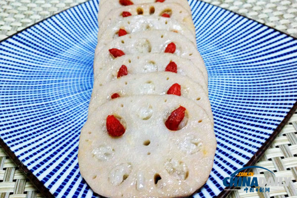 7. Take the lotus roof out. When it's not too hot, slice it and drip some honey onto the slices. Decorate with the Chinese wolfberries.