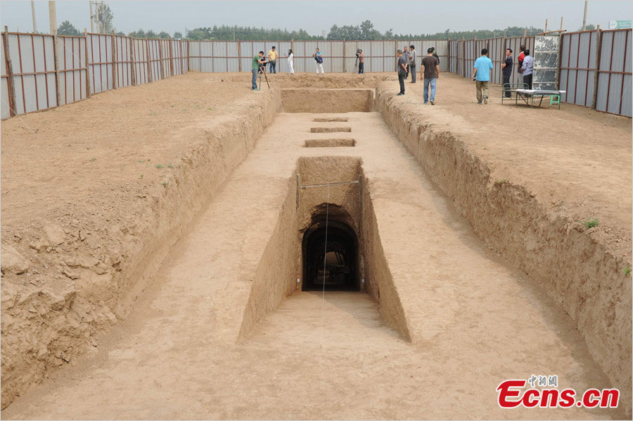 The tomb of Shangguan Wan'er (664–710), an influential female politician and poet during the regime of Empress Wu Zetian (690-705), is found near Xi'an Xianyang International Airport in Xianyang City of northwest China's Shaanxi province, according to the provincial cultural relics bureau on Monday. Archaeologists confirmed that the tomb belonged to Shangguan Wan'er from an epitaph that was seriously damaged when discovered. (Photo: ecns.cn)