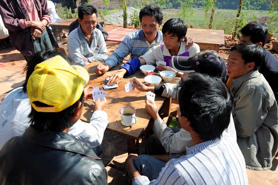 People play cards when having a rest before the wedding ceremony in a village in southwest China's Yunnan Province. (Provided to People's Daily Online/Li Xiaowen) |