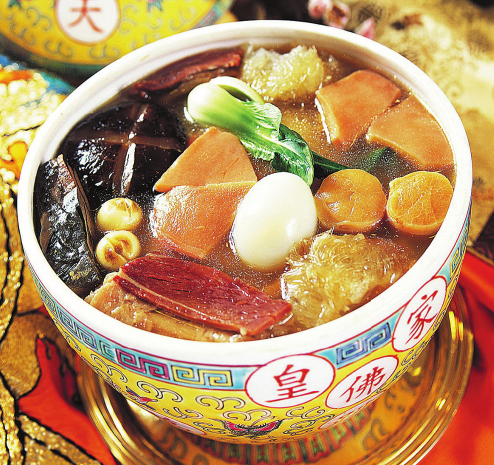 One dish representing imperial luxury is fotiaoqiang, "Buddha jumps over the wall" soup, a seafood soup with 21 ingredients that is simmered for several hours. The restaurant has more than 10 versions of this famous soup, with the various versions ranging in cost from 128 yuan ($21) to more than 2,000 yuan a pot, depending on the value of ingredients used.