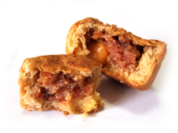 These are unique to Yunnan province, where its famous ham has won international awards. It's a salty-sweet filling that leaves a lingering fragrance in the mouth. Ignore what looks like bits of fat in the filling, it's candied winter melon, added for a tactile contrast to the very lean ham. These days, they also add nuts, seeds and rose-petal jam to the filling to accentuate the aroma.