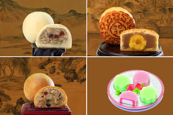 Clockwise from above left: The zilaibai, Cantonese egg yolk with white lotus paste mooncakes, ice skin moon cake and zilaihong mooncakes. Photos provided to China Daily |
