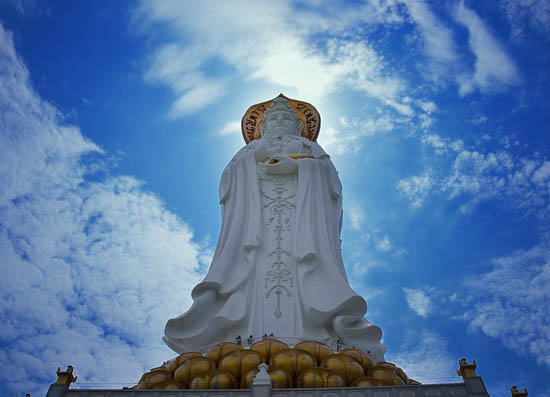 At 108 meters high, Nanshan Guanyin Statue is the tallest statue of Guanyin in the world. Guanyin is the bodhisattva, or goddess, associated with compassion. The statue is 15 meters higher than the Statue of Liberty in the United States.