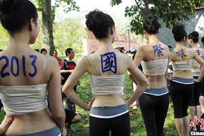 People view the embroideries displayed at the 18th Aqin Aytis festival in Fuyun County, northwest China's Xinjiang Uygur Autonomous Region, Sept. 21, 2013. Besides the Aqin Aytis, a kind of traditional oral art among the people of the Kazakh ethnic group, various traditional folk sports were also staged at the festival. (Xinhua/Ding Ning)