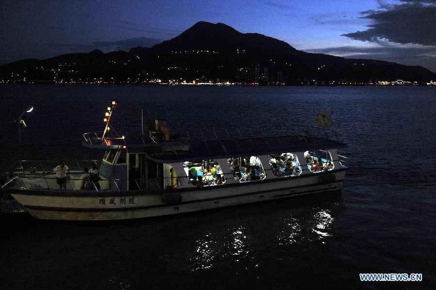 Tourists travel on the Tamsui River in a vessel in the Tamsui District of Xinbei City, southeast China's Taiwan, Sept. 23, 2013. Tamsui, meaning "fresh water", is popular as a site for viewing sunset. (Xinhua/Lu Peng)