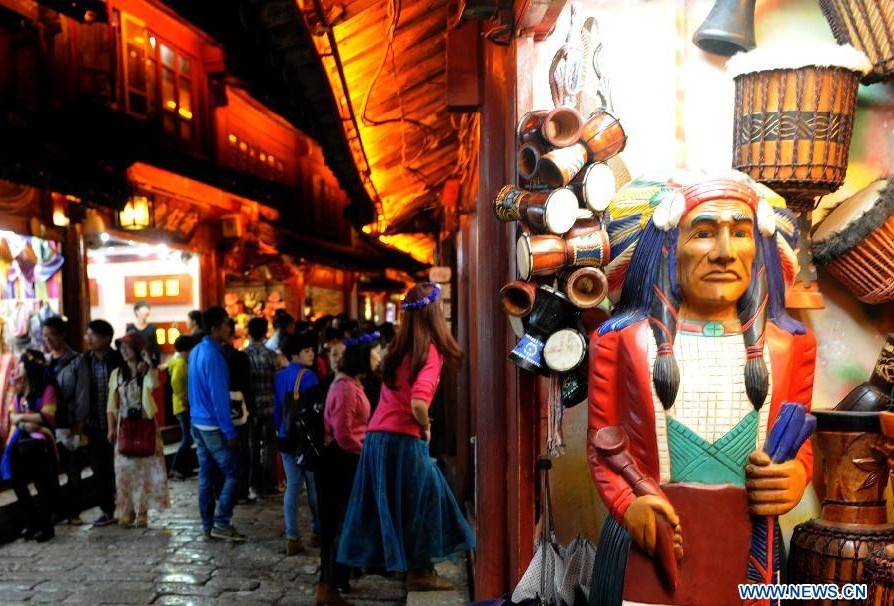 Tourists visit shops at the old town of Lijiang, southwest China's Yunnan Province, Sept. 23, 2013. Lijiang is renowned for its 800-year-old townlet that has been listed as the world cultural heritage by the UNESCO. (Xinhua/Zhu Xiang)