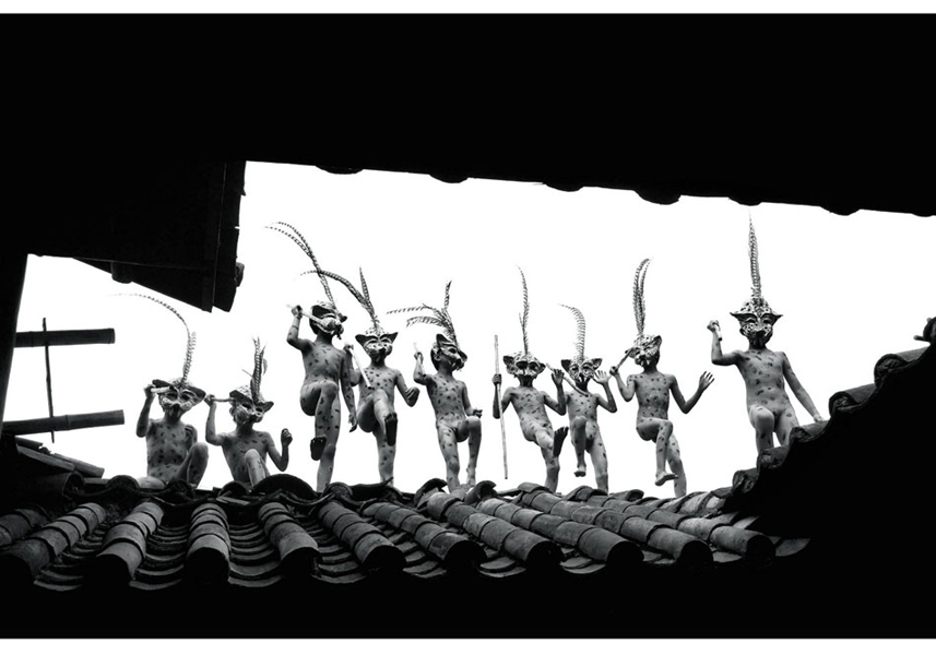 People perform "Xiaobaozisheng" dance in Damaidi Town, Shuangbai County, southwest China's Yunnan Province. "Xiaobaozisheng" is a kind of sacrifice activity. Naked people with leopard body paintings dance together, with sticks in hands and faces covered. (Provided to People's Daily Online/Ni Chengwei)