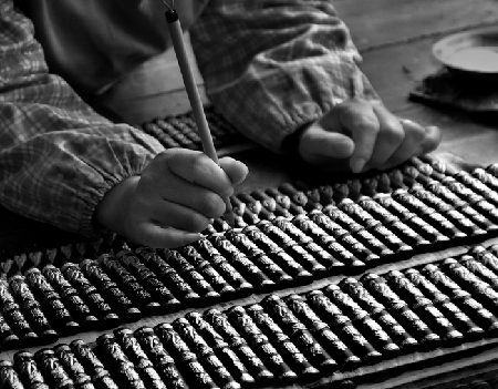 The Hukaiwen Hui Inkstick Factory is located in the Shexian County seat, about 20 km northwest of Huangshan City. Within an ordinary compound are several two-story grey workshops, commonly seen in the 1970s. Zhou has been working there for 34 years, and is familiar with every corner.