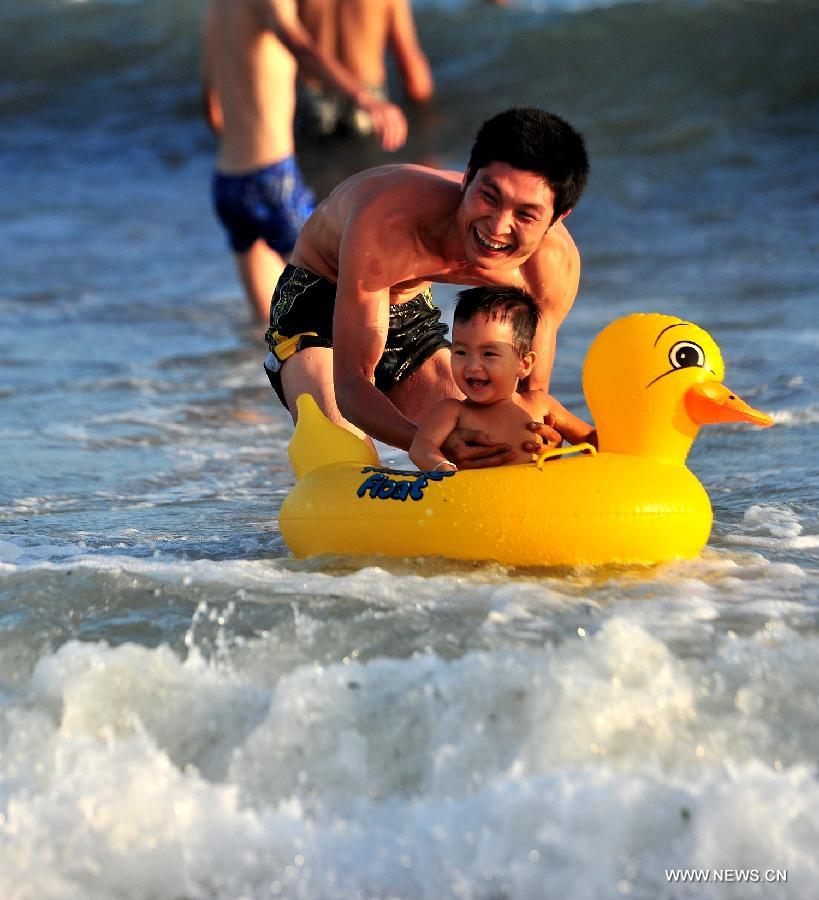 A boy plays with his father in the sea in Sanya, south China's Hainan Province, Oct. 1, 2013, the first day of the seven-day national holidays. [photo/Xinhua]
