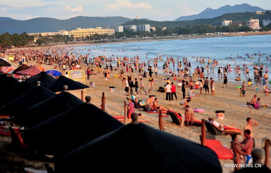 Tourists enjoy themselves on a beach in Sanya, south China's Hainan Province, Oct. 1, 2013, the first day of the seven-day national holidays. [photo/Xinhua]