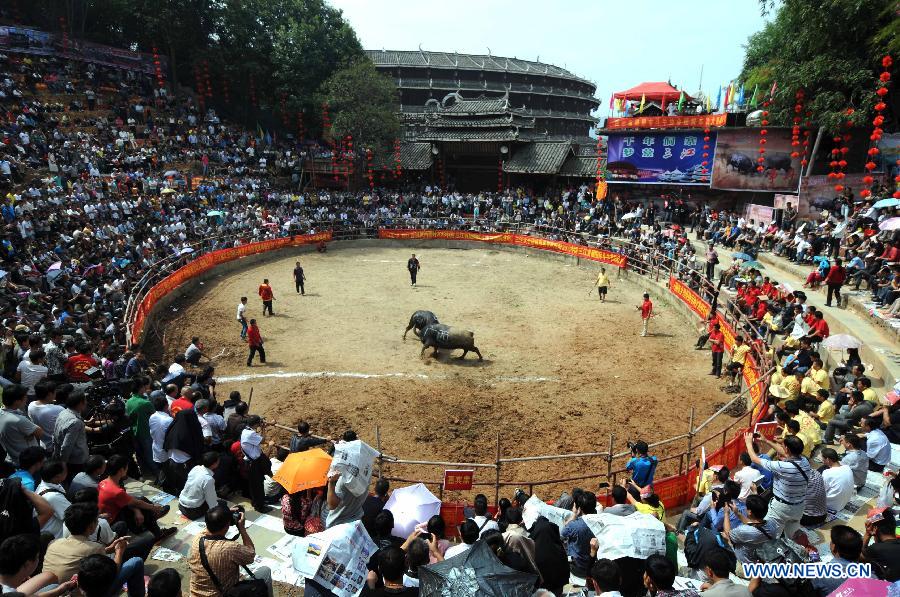 Visitors watch a bullfight festival at Dong Autonomous County of Sanjiang in Liuzhou City, south China's Guangxi Zhuang Autonomous Region, Oct. 1, 2013. A bullfight festival was held here on Tuesday. [Photo/Xinhua]