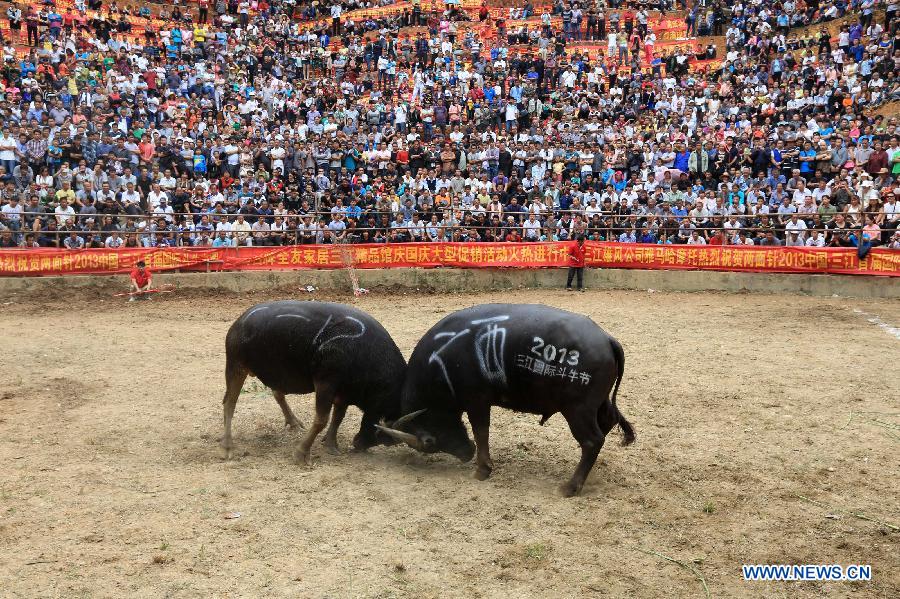 Visitors watch a bullfight festival at Dong Autonomous County of Sanjiang in Liuzhou City, south China's Guangxi Zhuang Autonomous Region, Oct. 1, 2013. A bullfight festival was held here on Tuesday. [Photo/Xinhua]