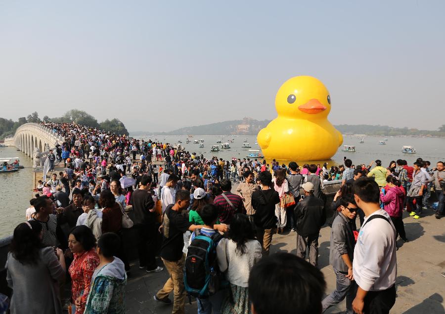 Tourists visit the giant yellow rubber duck, brainchild of Dutch artist Florentijn Hofman, at the Summer Palace in Beijing, capital of China, Oct. 3, 2013, also the third day of the seven-day National Day holiday. [Xinhua/Liang Zhiqiang]