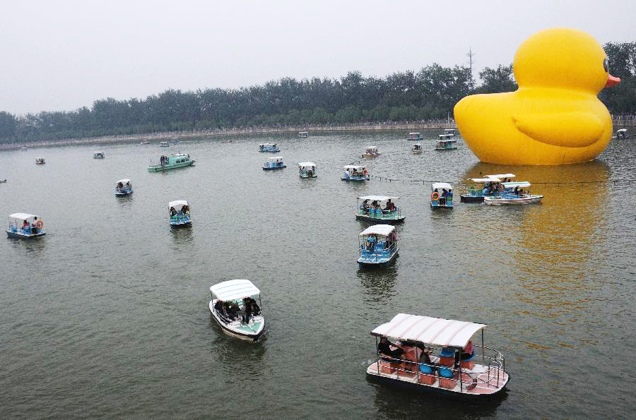 Tourists visit the giant yellow rubber duck, brainchild of Dutch artist Florentijn Hofman, at the Summer Palace in Beijing, capital of China, Oct. 3, 2013, also the third day of the seven-day National Day holiday. [Xinhua/Gong Wenbao]