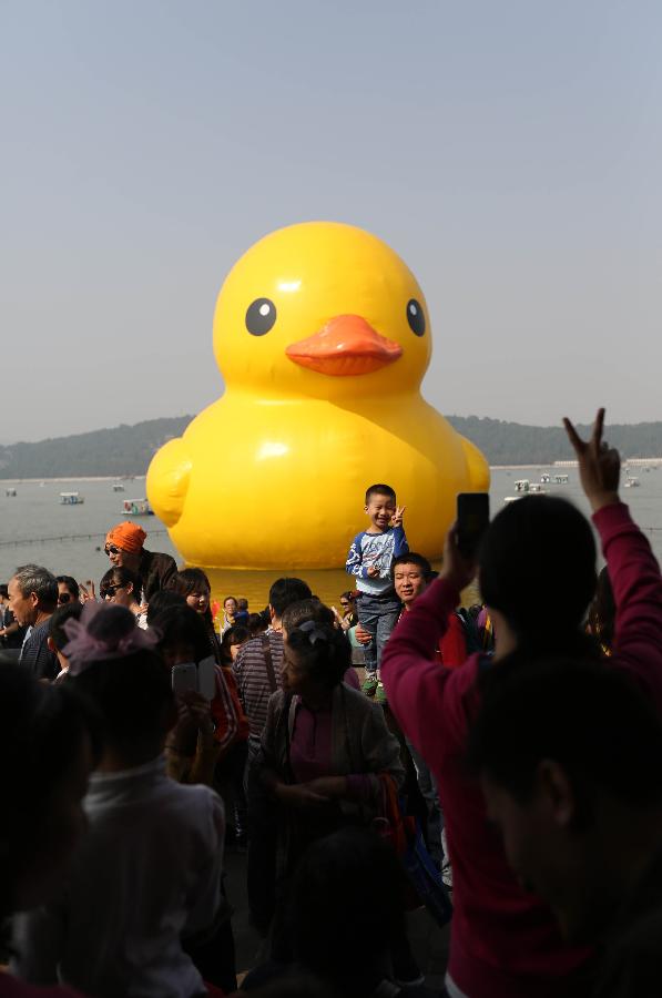Tourists visit the giant yellow rubber duck, brainchild of Dutch artist Florentijn Hofman, at the Summer Palace in Beijing, capital of China, Oct. 3, 2013, also the third day of the seven-day National Day holiday. [Xinhua/Gong Wenbao]