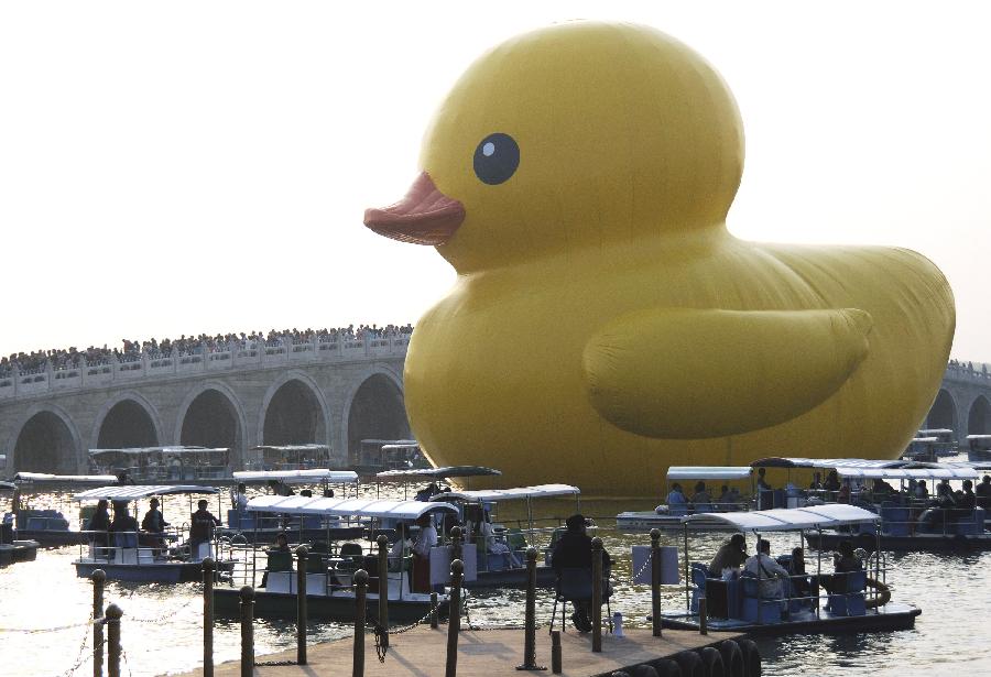 Tourists visit the giant yellow rubber duck, brainchild of Dutch artist Florentijn Hofman, at the Summer Palace in Beijing, capital of China, Oct. 3, 2013, also the third day of the seven-day National Day holiday. [Xinhua/Gong Wenbao]