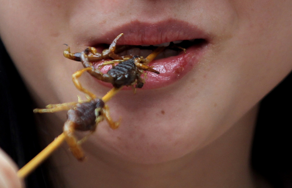 A woman eats fried scorpions in May on Wangfujing Street. It’s said that scorpions lower body heat and detoxify the body. Wang Jing / China Daily
