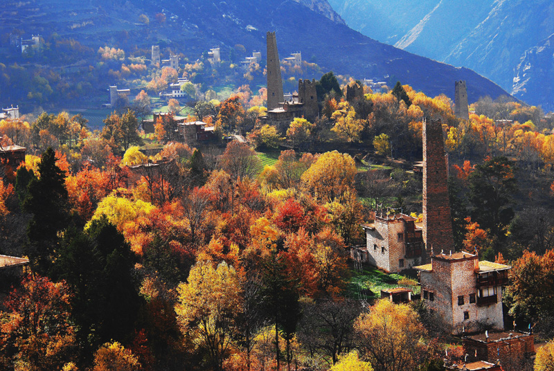 The Tibetan village offers a fall view which will probably make you reevaluate your definition of "fall". Many residential towers stand among the trees like soldiers on guard. [Photo: CRIENGLISH.com]