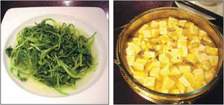 I love tofu and wanted to try the tofu in crab sauce as the photo on the menu looked delicious. It was served in a clear glass casserole dish set within an ornate golden basket, which raised my expectations for what I thought would be a simple dish. It was indeed simple, but the freshness of the ingredients transported it to the realm of the spectacular.