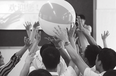 Teachers, students and parents take part on the first day of an arts and craft class for mentally challenged students at Guangzhou Haizhu Business Vocational School on Monday. |