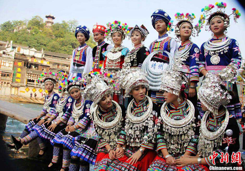 4th Phoenix Miao Silver Dress and Culture Festival was held in Hunan province’s Fenghuang country on Oct 13. 17 teams of Miao people from Hunan, Guangxi, Yunan and Guizhou gathered together to show their traditional costumes and headwear to tourists and local inhabitants. Miao women’s silver headdresses have added beautiful scenery to the festival.