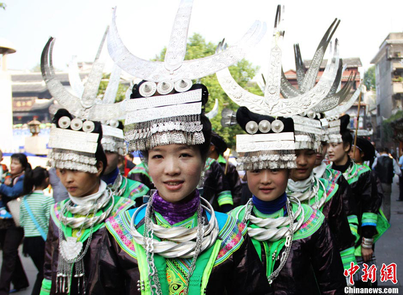 4th Phoenix Miao Silver Dress and Culture Festival was held in Hunan province’s Fenghuang country on Oct 13. 17 teams of Miao people from Hunan, Guangxi, Yunan and Guizhou gathered together to show their traditional costumes and headwear to tourists and local inhabitants. Miao women’s silver headdresses have added beautiful scenery to the festival.