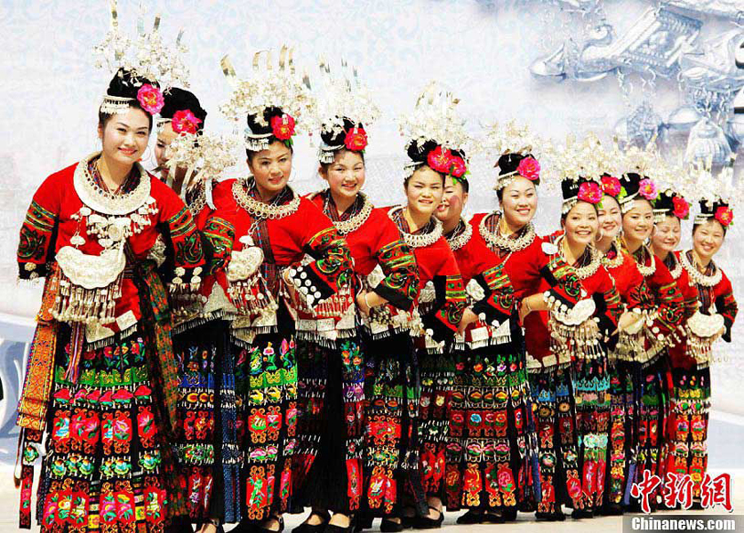 Miao women wearing silver headdress and ethnic costumes get together to demonstrate their traditions to tourists and local inhabitants in an ethic group area- Hunan province’s Fenghuang county on Oct. 13. (Photo/CNS)
