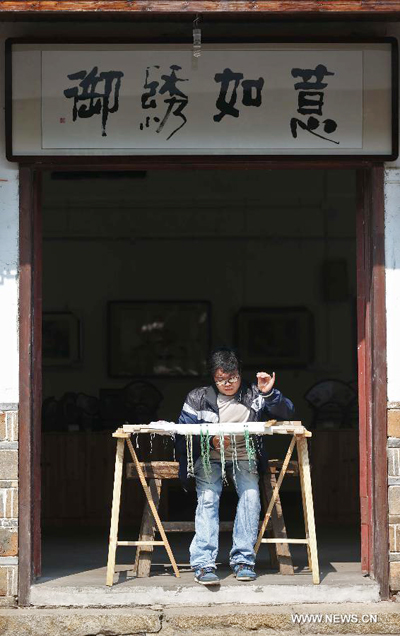 22-year-old Jiang Tongwan does embroidery work at his workshop in the town of Jinggang near Changsha, central China's Hunan Province, Oct. 11, 2013. Jiang, graduated from Hunan Arts and Crafts Vocational College, is the co-founder of a newly-established embroidery workshop in the ancient town of Jinggang. The physical disability resulted from a childhood disease didn't cast shadow on his ambition of starting his own business. He started learning Hunan embroidery, traditionally considered as a skill for women, in college in 2010, when the school began to recruit male students. After graduation, Jiang rent a store with his classmate Huang Jinyu to start their embroidery workshop. Jiang wished that it is not only a place for selling his embroidery but also a gallery of excellent embroidery works from other folk artists. (Xinhua/Li Ga)