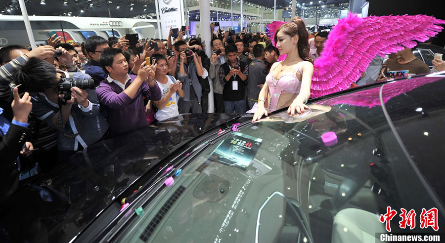 A model in eye-catching lingerie stands beside a car at Wuhan Motor Show 2013 on Oct. 20, 2013. (CNS photo/Zhang Chang